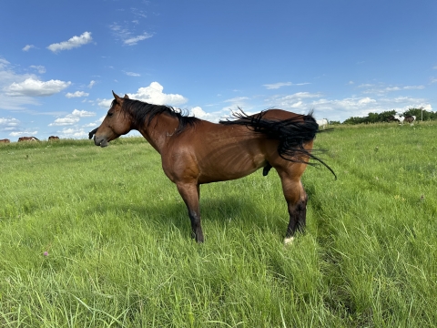 Rainbow Meadows does not know if he has a breeding history. If he has been involved in breeding, he may manifest stallions-like behaviors with mares.