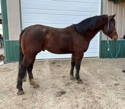 Prior to seizure he was confined in a 12x12 outdoor stall, in mud to his mid-cannon, sharing the space with a full-sized Coriente cow, a metal hay feeder and a water trough.